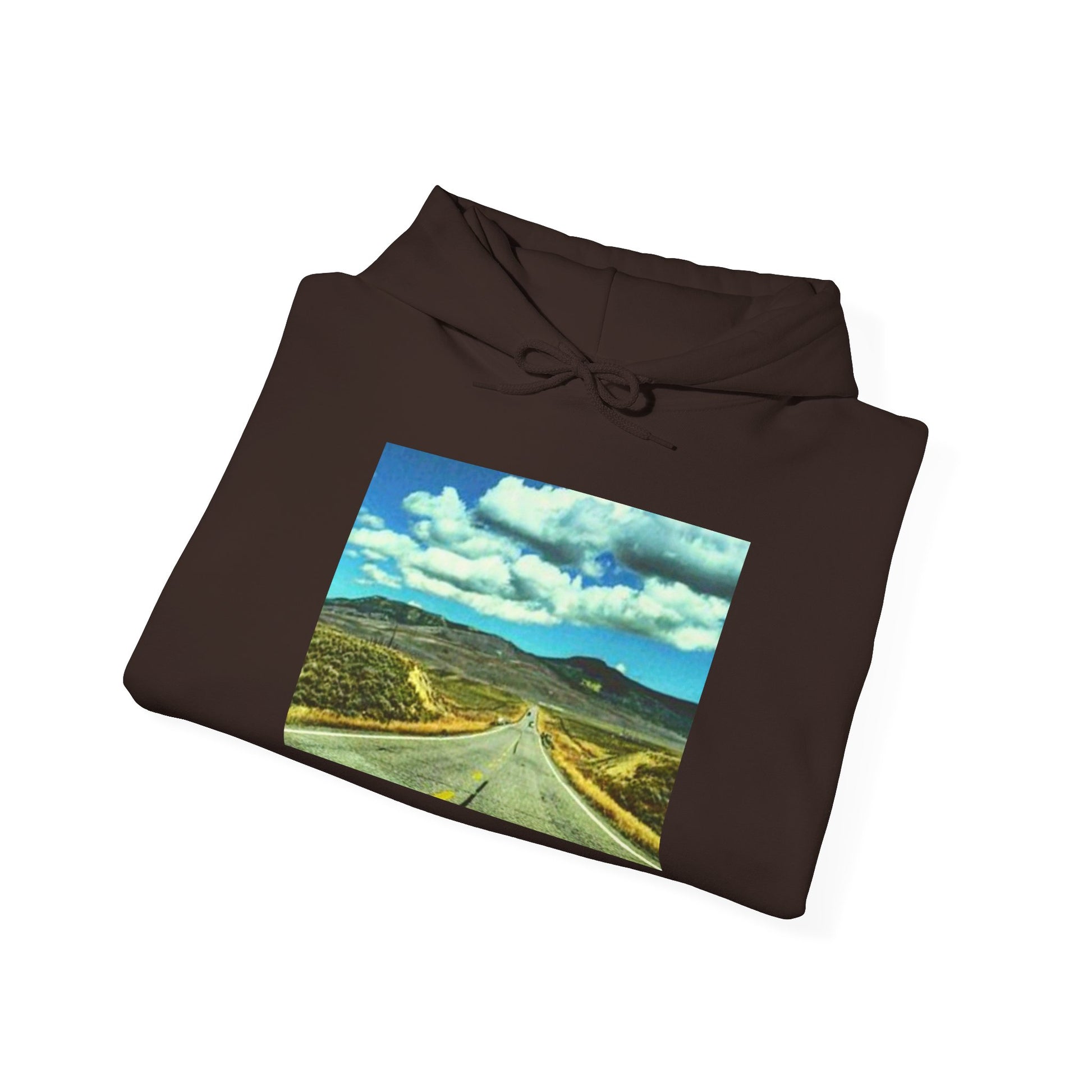 This cozy hoodie carries the open road on its chest — a sunlit highway stretching toward distant mountains. Soft, medium-weight fleece wraps you in warmth while the vivid road-scene print brings a wanderer’s calm to everyday wear. Slip your hands into the roomy kangaroo pocket, tighten the color-matched drawcord against a chilly breeze, and feel like you’re headed somewhere meaningful, even if it’s just a weekend drive or a quiet morning walk. Subtle, durable construction and ethically sourced fibers mean you can wear it often without worry. It fits into a life that values slow mornings, spontaneous trips, and quiet moments of reflection.